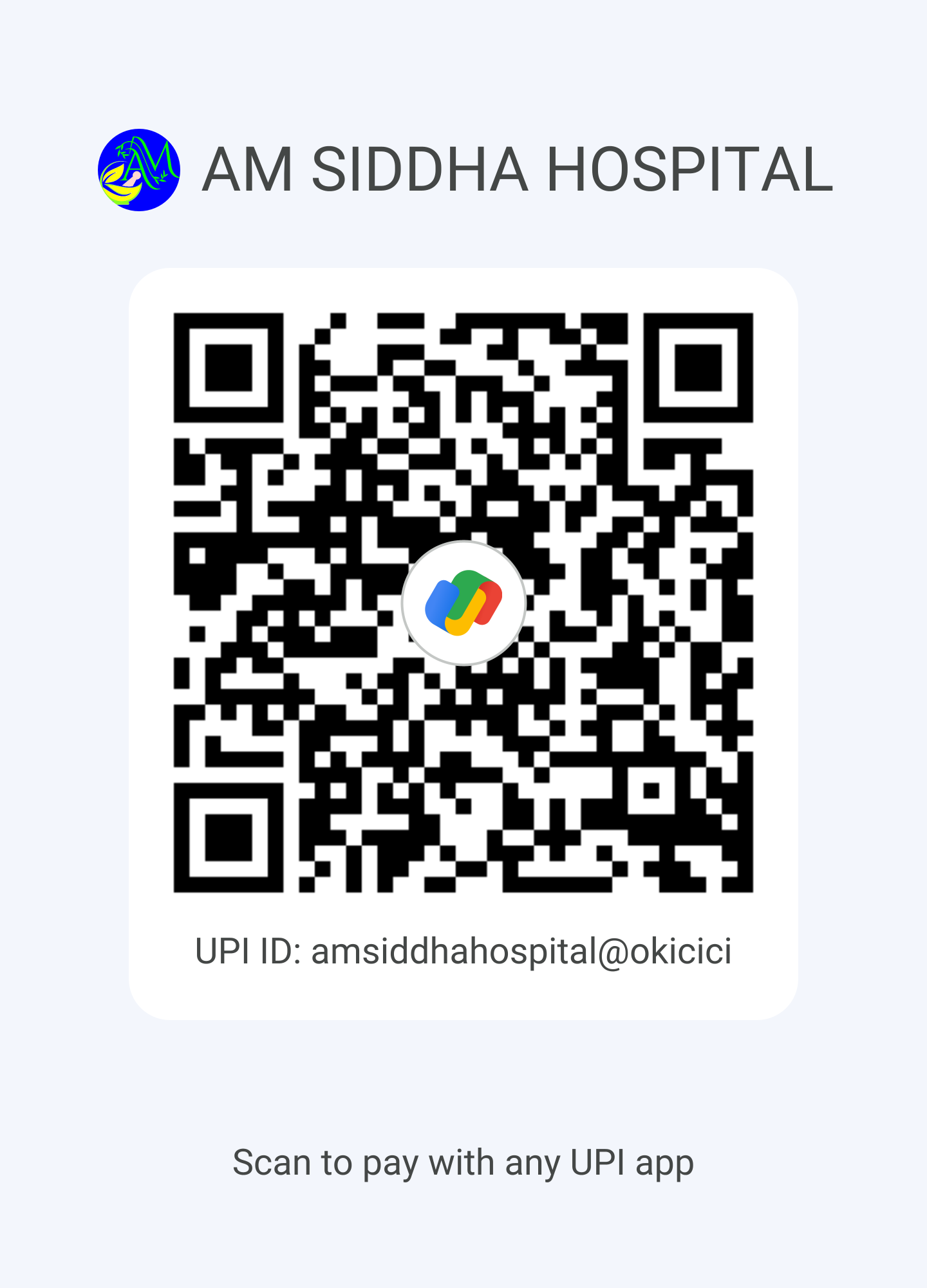 Easily pay for your services to AM Siddha Hospital , by scanning the below QR code. Use your mobile payment app for a quick, secure, and contactless transaction. Fast, convenient, and hassle-free. You can also use this Payment for making advance payment for Booking an Appointment with AM Siddha Hospital.